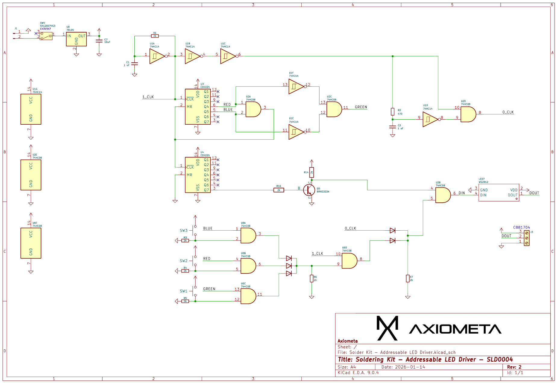 Each LED needs exactly 24 bits 8 green, 8 red, 8 blue, in that order. A 74HC binary counter handles this. On every clock cycle, the counter advances by one. When it hits 24 (both the 8 and 16 outputs go high), an AND gate resets it back to zero.