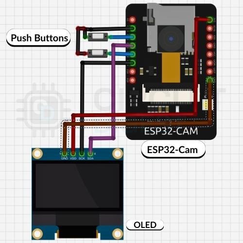 Connect the ESP32-CAM, OLED display, and buttons on a breadboard. Set the I2C pins for the OLED and assign GPIOs for the buttons. -