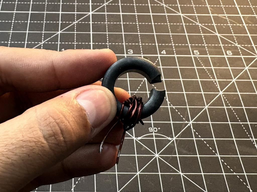 This is the most critical and tricky step. We need to cut a small gap in the toroid where the Hall sensor will sit. Let me tell you what I did, I just took a plier and broke it into two pieces. This may be non ideal but I can later glue the parts to fix it. You can use a Dremel with a thin cutting disc or a fine hacksaw blade. Cut slowly and steadily. After cutting, use fine sandpaper to smooth both cut faces. The smoother the surfaces, the smaller the effective air gap, which means better flux coupling to the sensor. The air gap should be as small as practically possible while still fitting the sensor. A larger gap means more flux leakage and lower sensitivity.