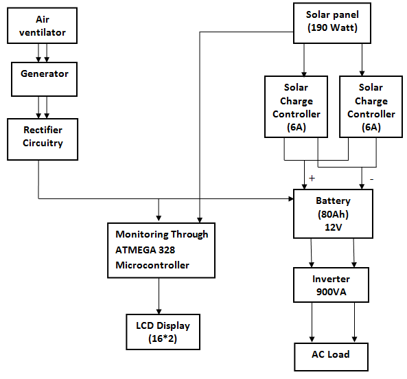 To improve reliability and ensure energy generation even when wind is low, the system also includes solar panels connected through a charge controller. Both wind and solar sources feed a 12V battery system, which can power small loads such as lighting, phone chargers, and fans.