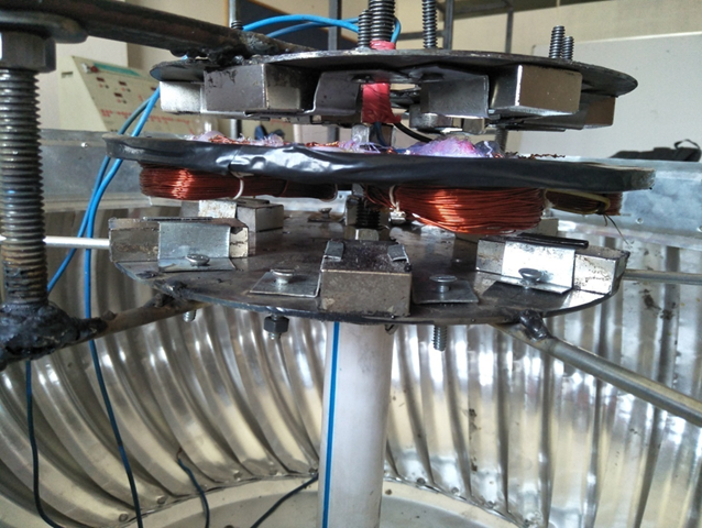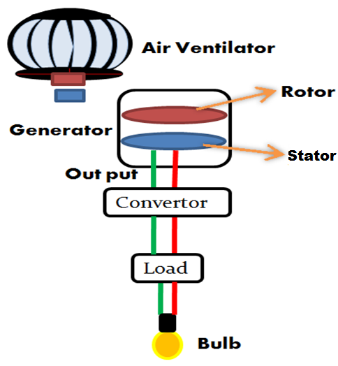 The result is a hybrid renewable energy system where a rooftop ventilator is modified to drive a small axial-flux permanent magnet generator. When the ventilator spins, magnets on the rotor pass over copper coils in the stator and produce electrical energy. The generated AC power is rectified into DC and used to charge a battery.