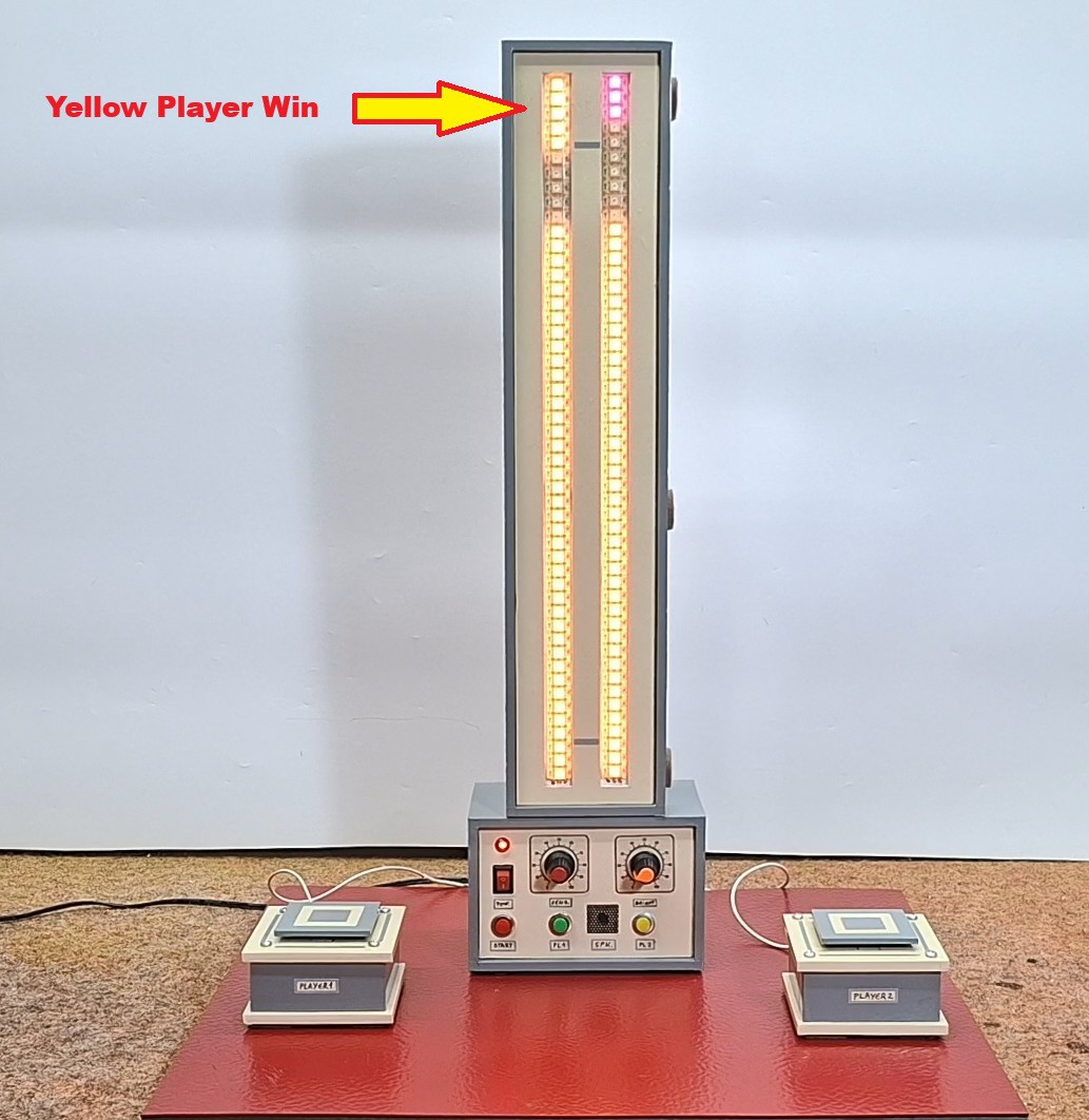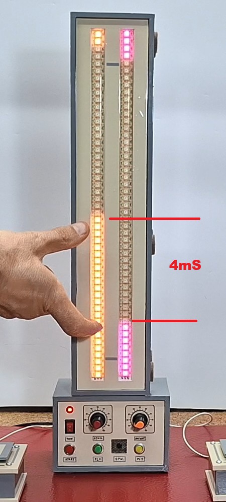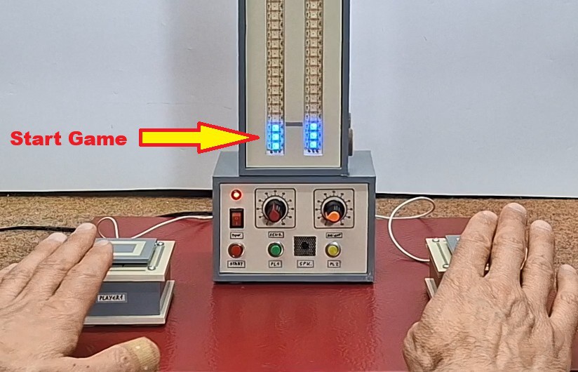 Since the game is based on reaction speed, it is desirable that the reaction time can also be displayed somehow on the strips. For this purpose, I used the Select potentiometer. In the extreme left position, the active scale (45 LEDs) represents a time of 10 milliseconds (4 LEDs approximately indicate 1 millisecond), and in the extreme right position, the scale displays a time of 1 second (one LED indicates 22 milliseconds). At the end of any individual game, we can "Zoom" the time. So we can very precisely determine the reaction time of the two players (theoretically with an accuracy of 0.25mS !!!). This will become clearer to you during the specific demonstration game that you will watch below.