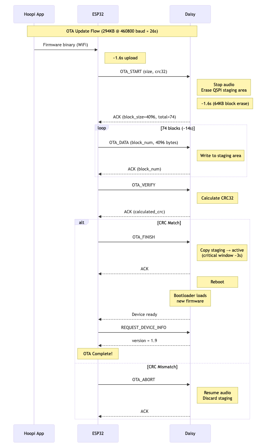 I (19469) OTA: State -> STARTED, sending OTA_START... I (21069) OTA: OTA_START ACK received: block_size=4096, total_blocks=74 I (21069) OTA: State -> SENDING, 74 blocks to send I (35289) HOOPI: OTA_VERIFY sent I (35389) OTA: OTA CRC verified: 0x170d76b6 I (35389) OTA: OTA_FINISH sent, waiting for copy to complete... I (38179) OTA: OTA_FINISH ACK received - copy complete, Daisy rebooting... I (42439) OTA: FW version 1.9 matches expected, OTA complete!