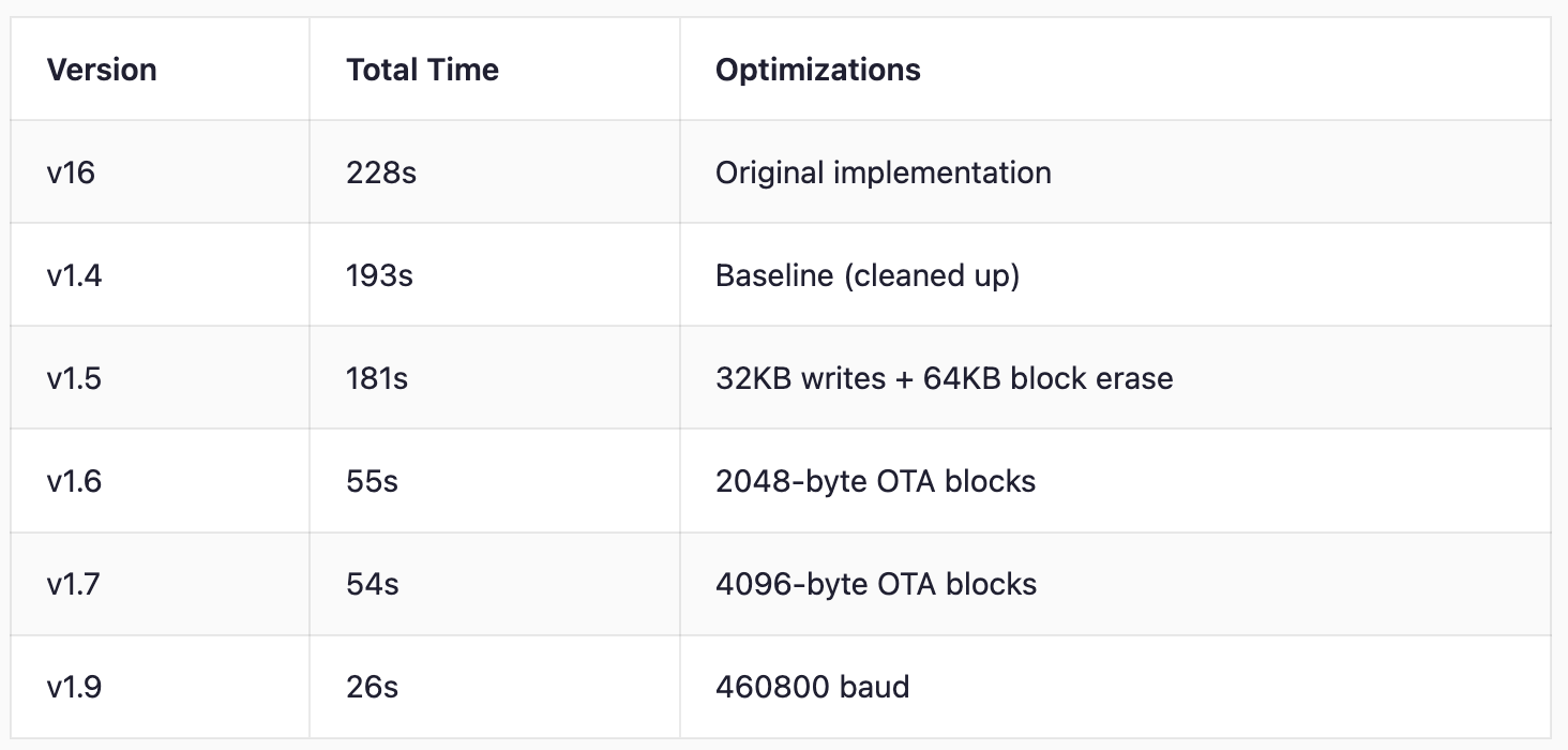 The initial implementation took 228 seconds for a 294KB firmware update. Users were waiting nearly 4 minutes, and the "critical window" (where power loss could soft-brick the device) was over 60 seconds.