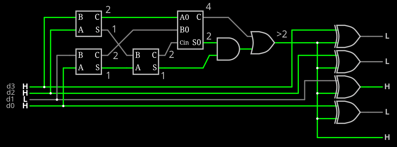 - The 18-bit word is cut in 2 halves that get independently popcounted and inverted: it's "TMPI" (Transition-Minimised Parallel Interface) or "Bus Inversion" (in DDR4/DDR5 terminology)