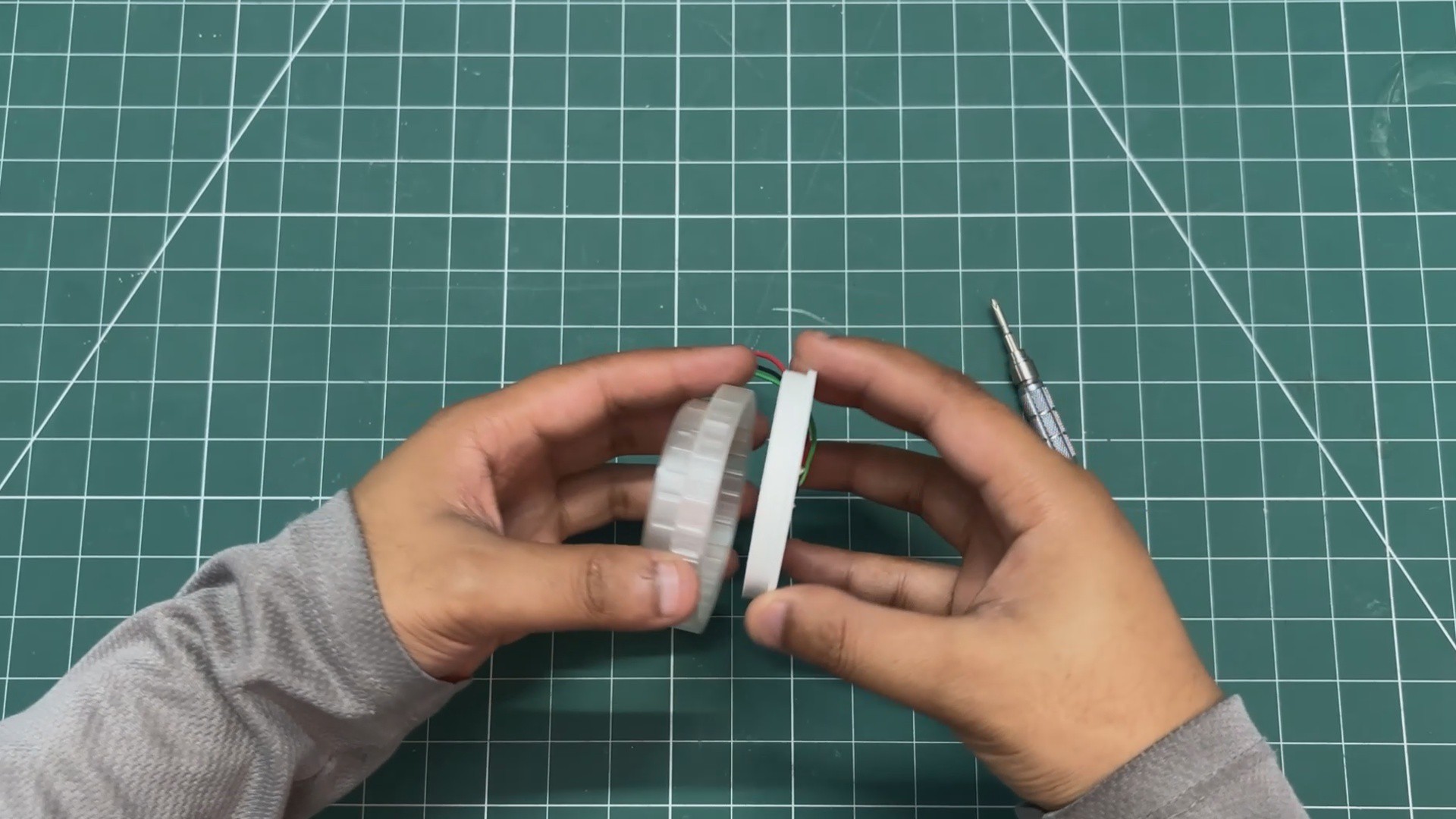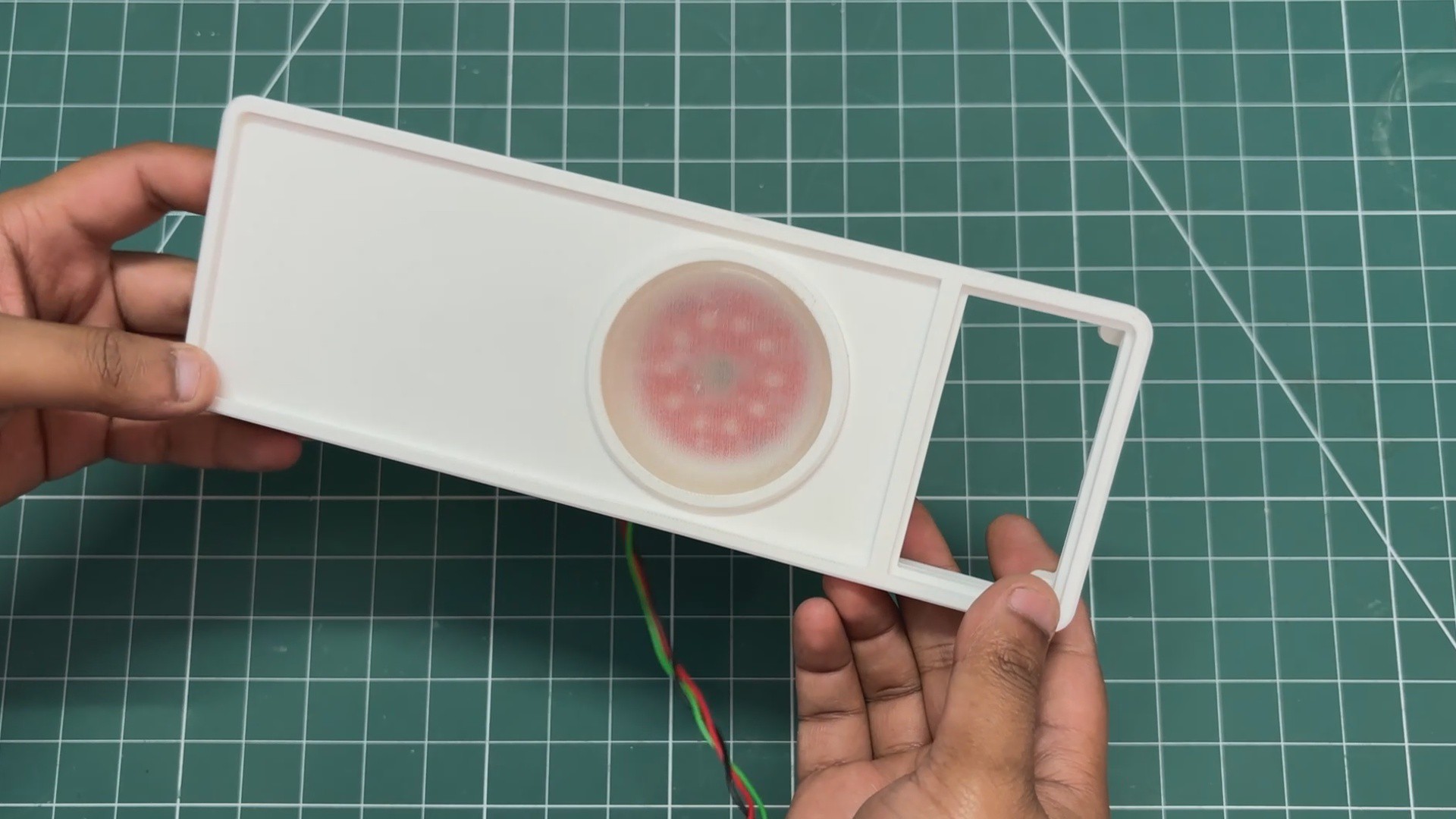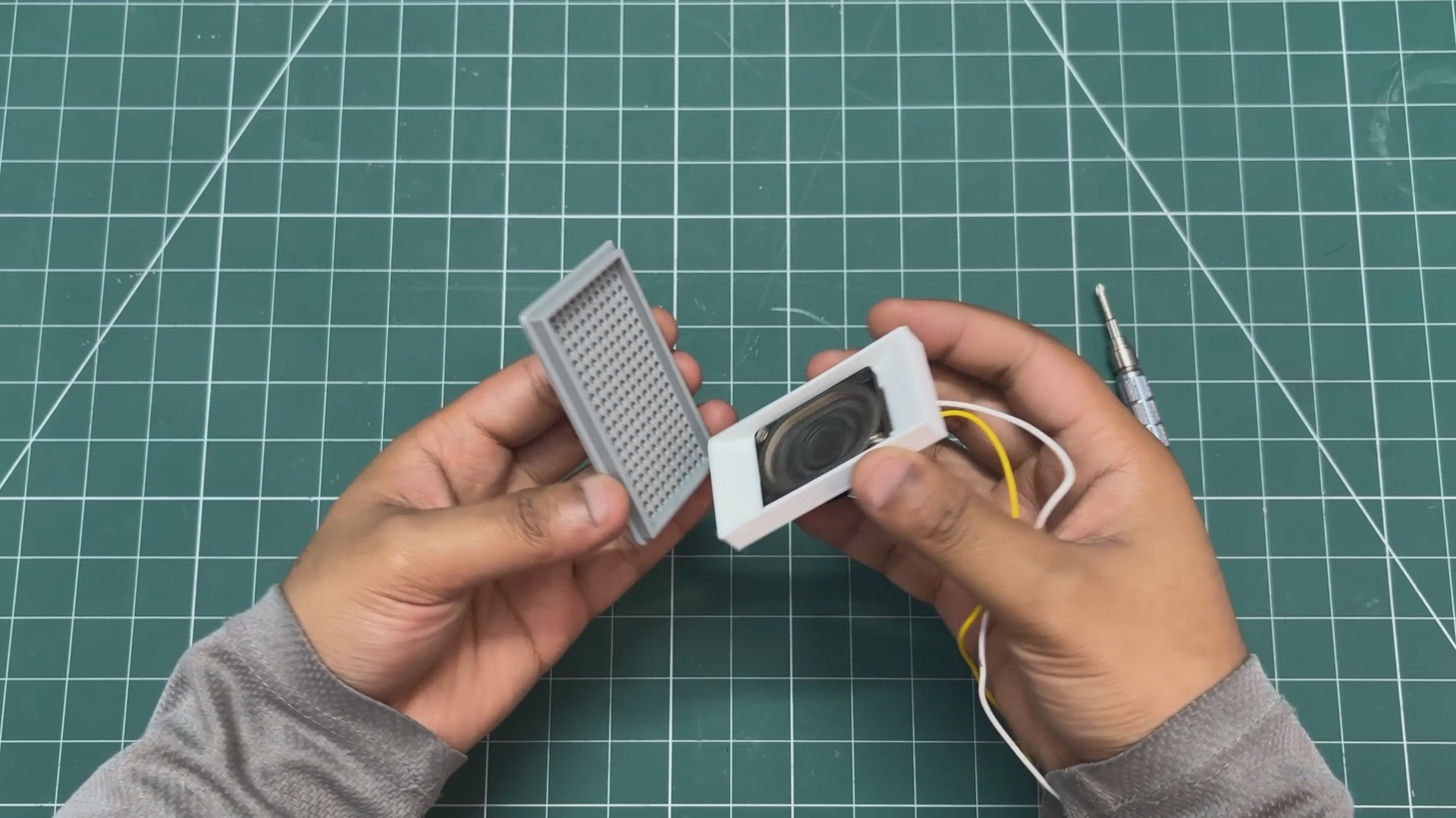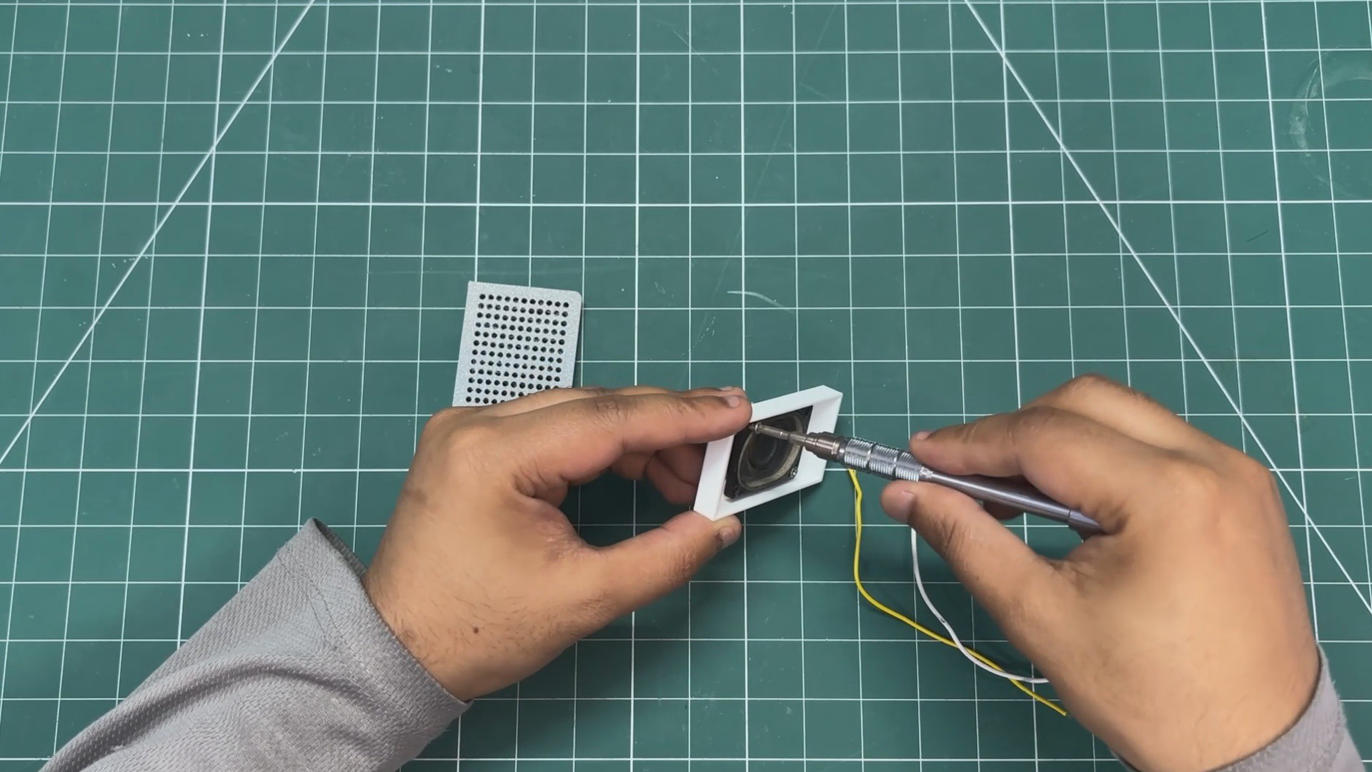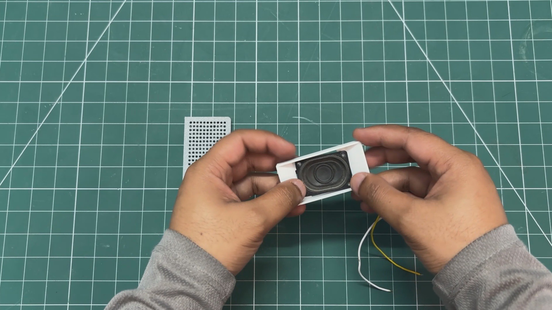 - The speaker grill is then positioned over the speaker holder, and both parts are pressure-fitted together.