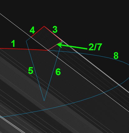 Interestingly it will start by cutting the prfile (top skin) to the middle of the V (1), then perform motion (burning) the shell (2, 3, 4) before plunging to the core for the "V" (5, 6), then finishing the cut again at the midlle of V (7) before going again on the profile (8).