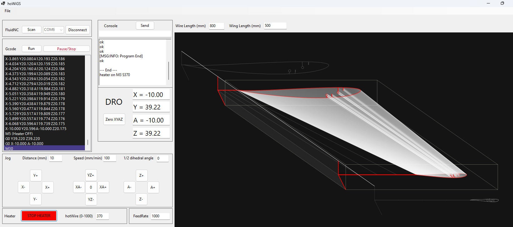 hoWiGS is a lightweight, high-performance G-code streamer specifically designed to drive 4-axis CNC foam cutters via USB using the FluidNC firmware. It balances a simplified user interface with advanced features required for precision wing manufacturing.