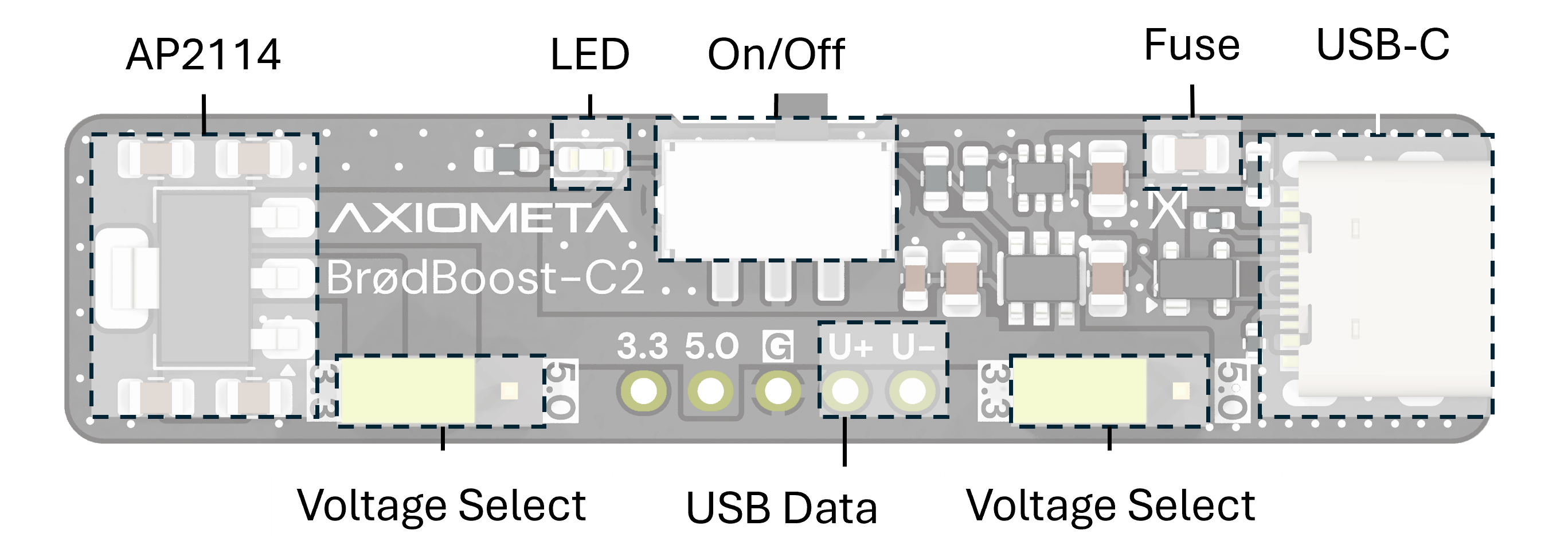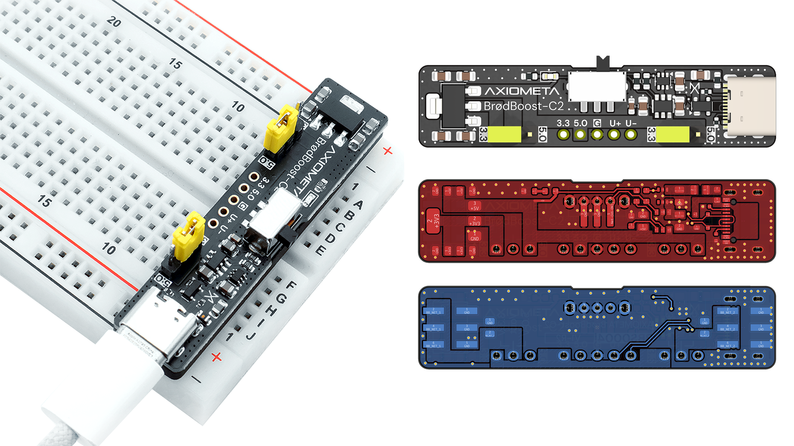BrødBoost-C2 is a USB-C breadboard power supply that delivers clean 5V and 3.3V power directly to your breadboard. It features short-circuit fuse protection, USB ESD protection, an ideal diode for reverse polarity safety, a load switch with soft startup, and ferrite bead filtering for low-noise operation. An on/off switch and power LED keep you in control, while USB data passthrough keeps your lines accessible.