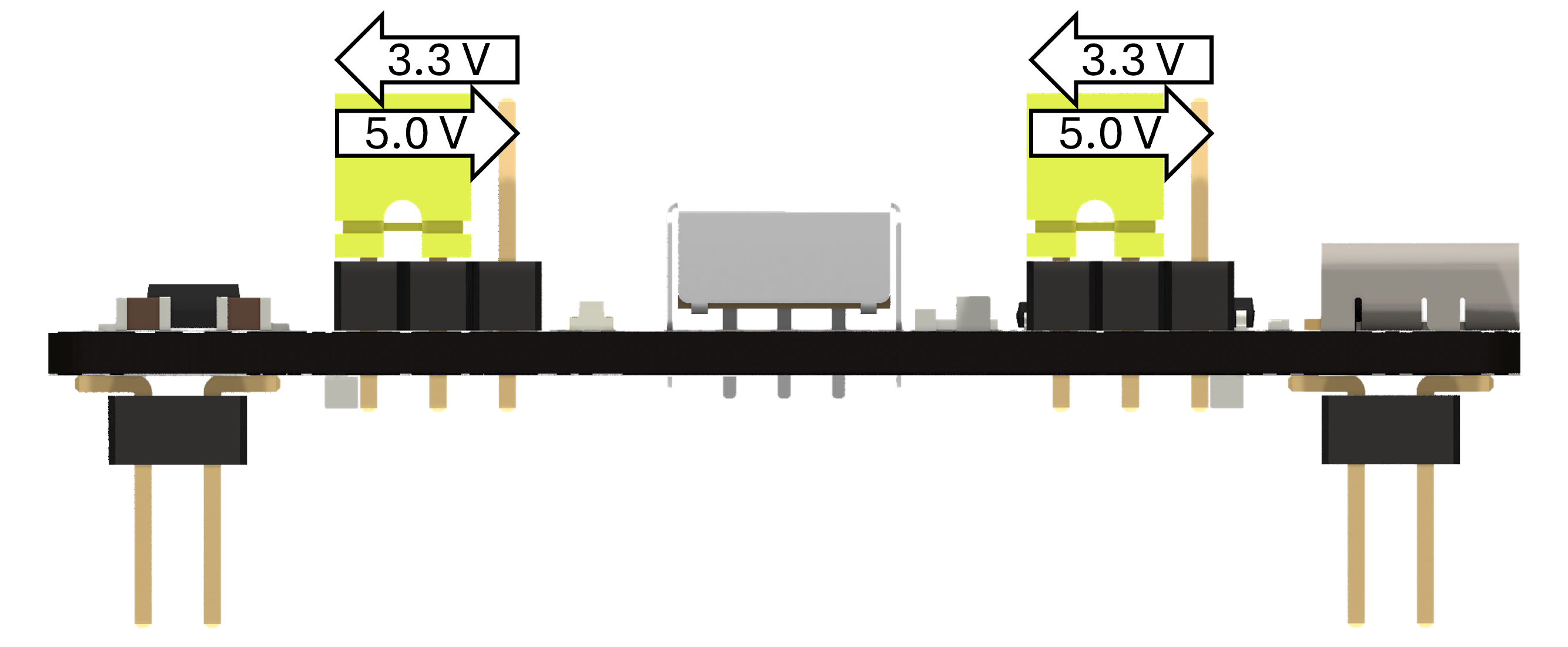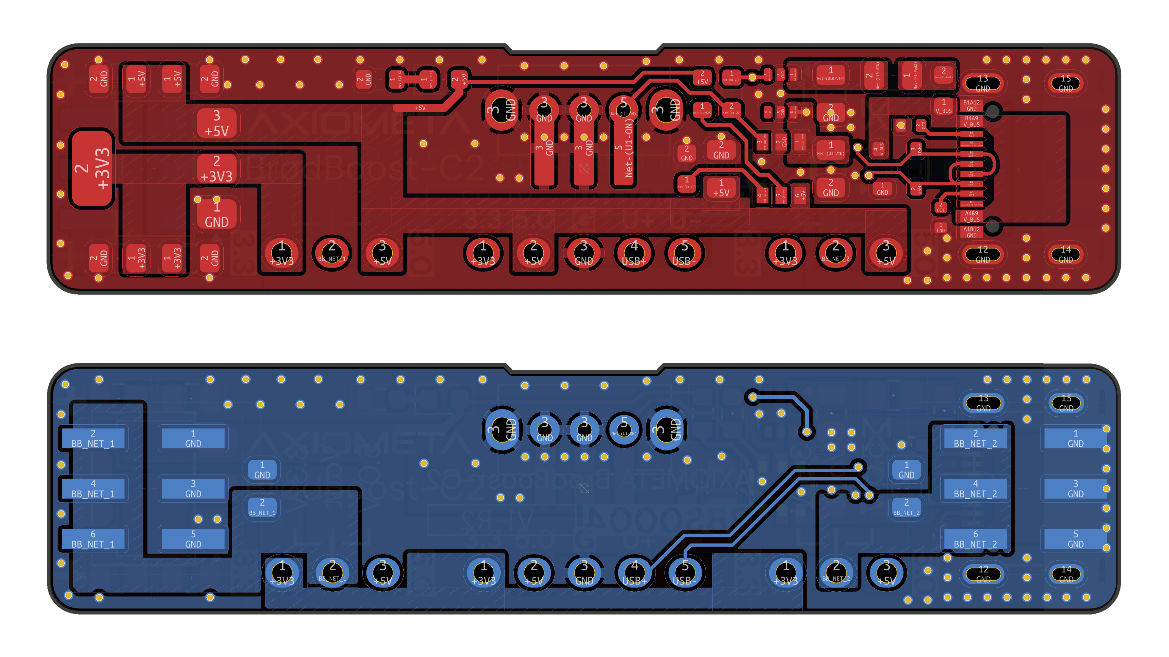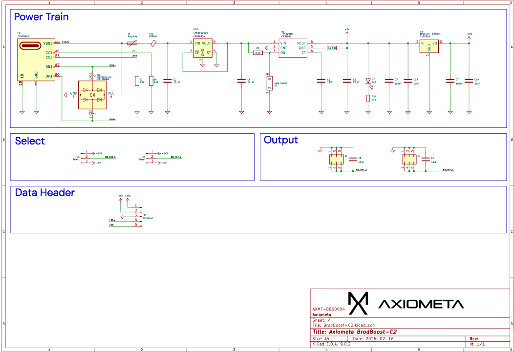 A USB-C receptacle accepts a standard USB-C cable. The CC1 and CC2 lines are pulled to ground through 5.1 kΩ resistors to negotiate 5 V from the host. Power flows through a ferrite bead for noise suppression, a 1 A polyfuse for short-circuit protection, and decoupling capacitors. An ideal diode provides reverse polarity and overvoltage protection. A load switch with controlled soft startup prevents inrush current. The power switch and red power LED sit in series on the main rail. USB ESD protection is included on the data and power lines. Step-down conversion from 5 V to 3.3 V is handled by the AP2114H-3.3TRG1 LDO regulator. Both voltage outputs are routed to 1×3 2.54 mm headers for rail selection. A separate header provides access to 5 V, 3.3 V, ground, and USB data lines.
