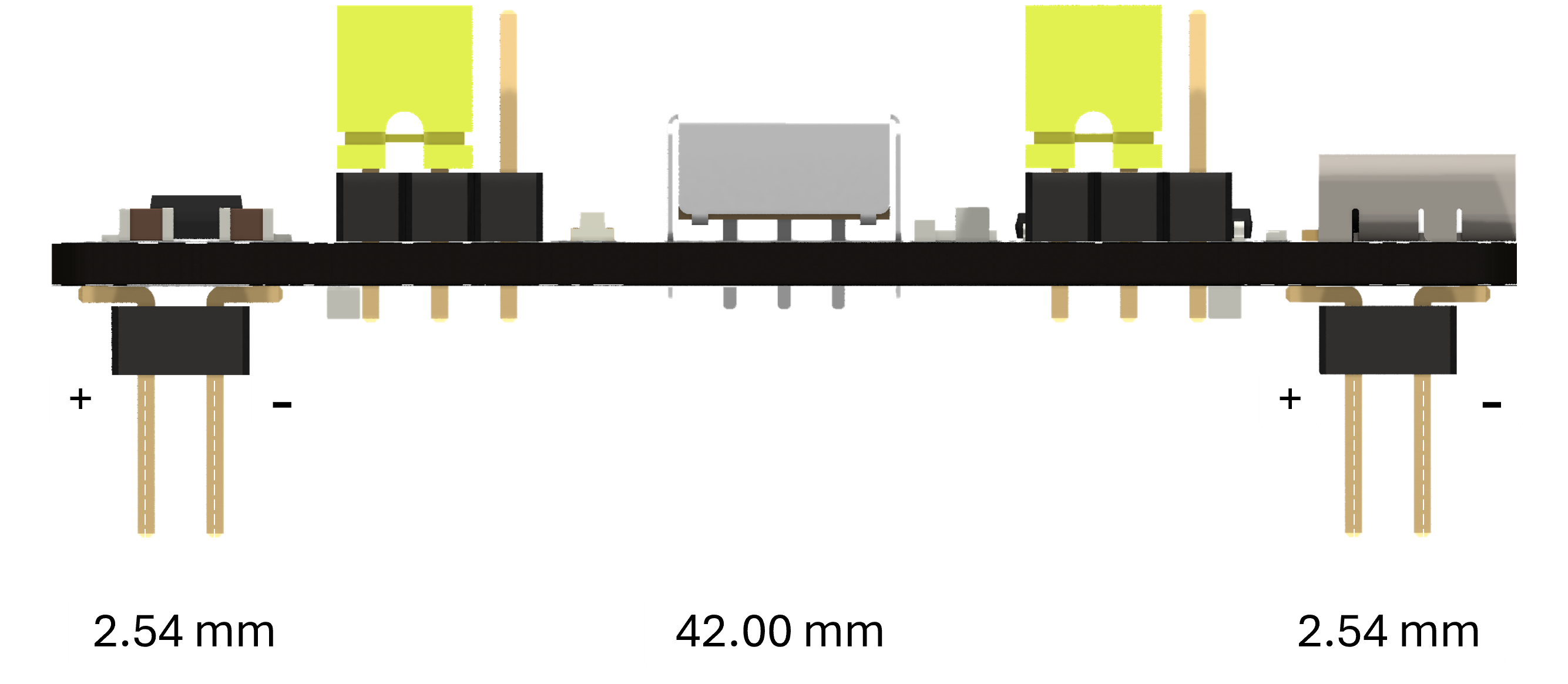 BrodBoost-C2 is a two-layer PCB measuring 12 mm by 54.0 mm, designed to maximize trace width and optimize the switching regulator's ground return path. This layout comfortably supports the nominal device current of approximately 1 A.