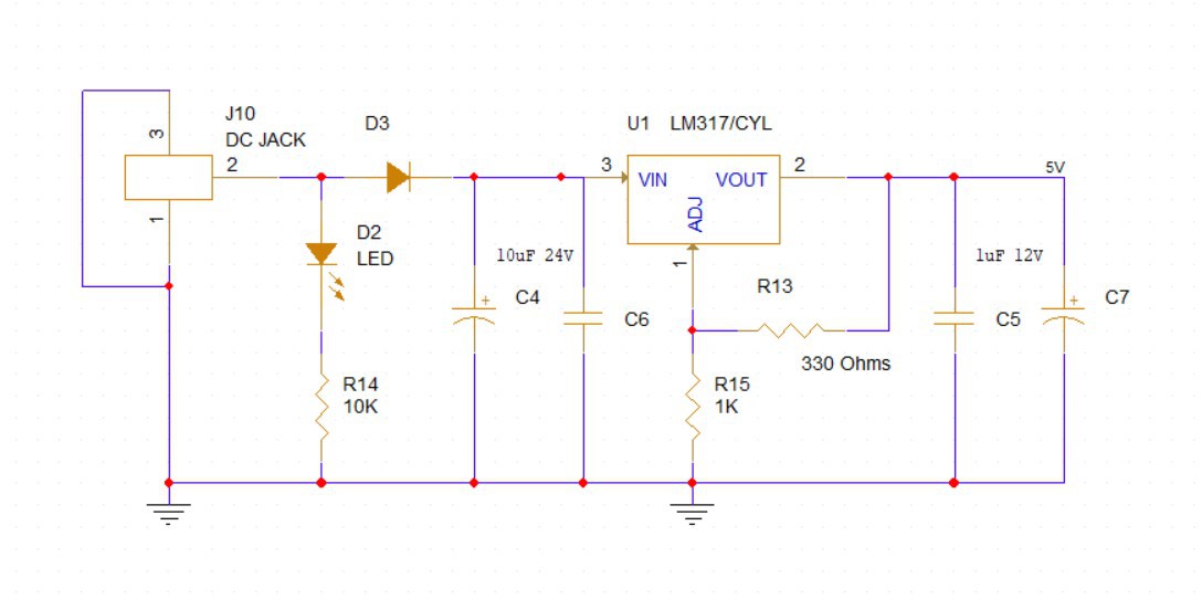 For power, we added an LM317, which is an adjustable three-pin positive voltage regulator capable of supplying more than 1.5A over an output voltage range of 1.25V to 37V.