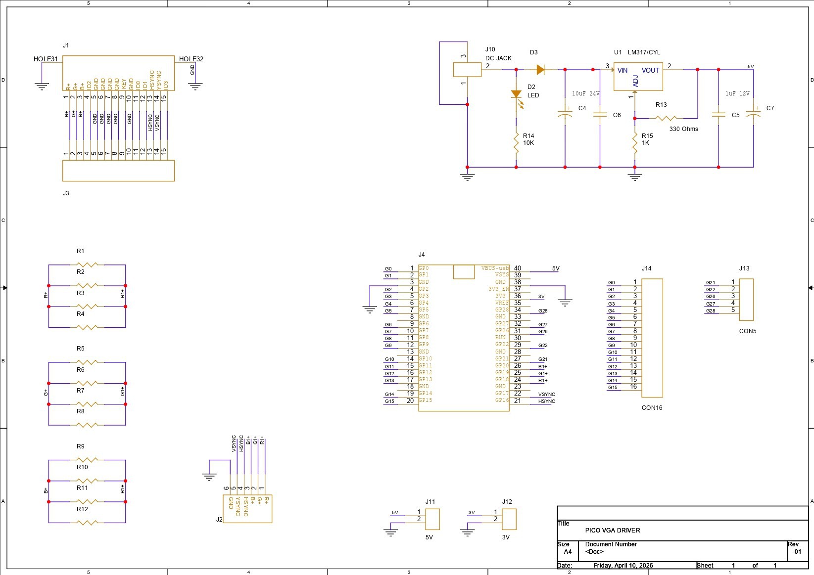 We begin the PCB design process by preparing the schematic first. Here, we recreated the connection of the D-Sub 15 connector with the Pico wiring. In this, we paired Pico GPIO18, GPIO19, and GPIO20 with Pin 1, Pin 2, and Pin 3 of the VGA connector, with three resistors placed in between.