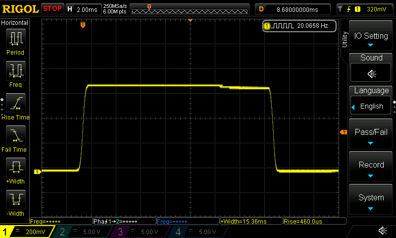 - The current is converted into a voltage by a resistor and the pulse width measured on the oscilloscope.
