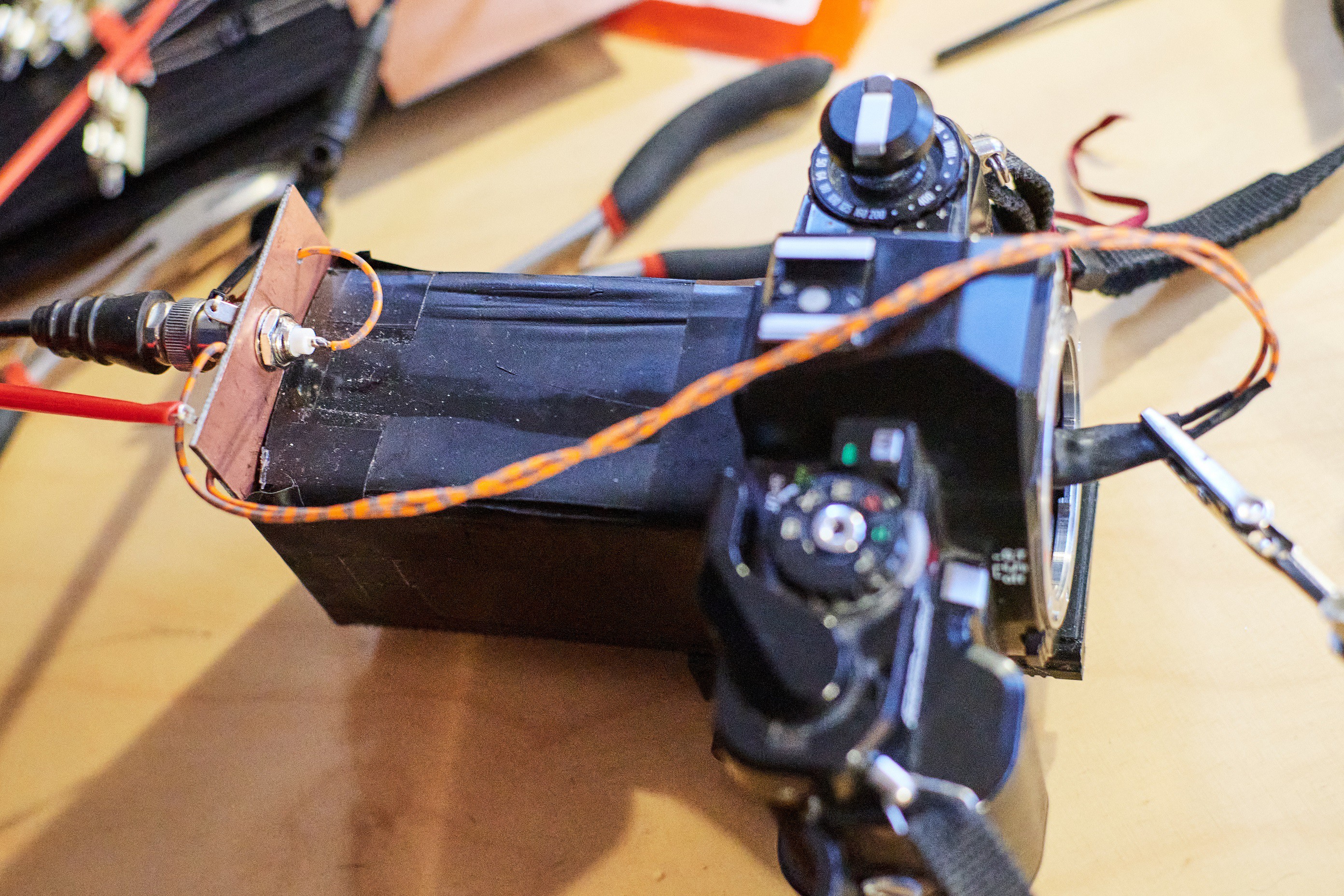 - A photo transistor is placed right behind the camera with the film door open looking into the shutter.