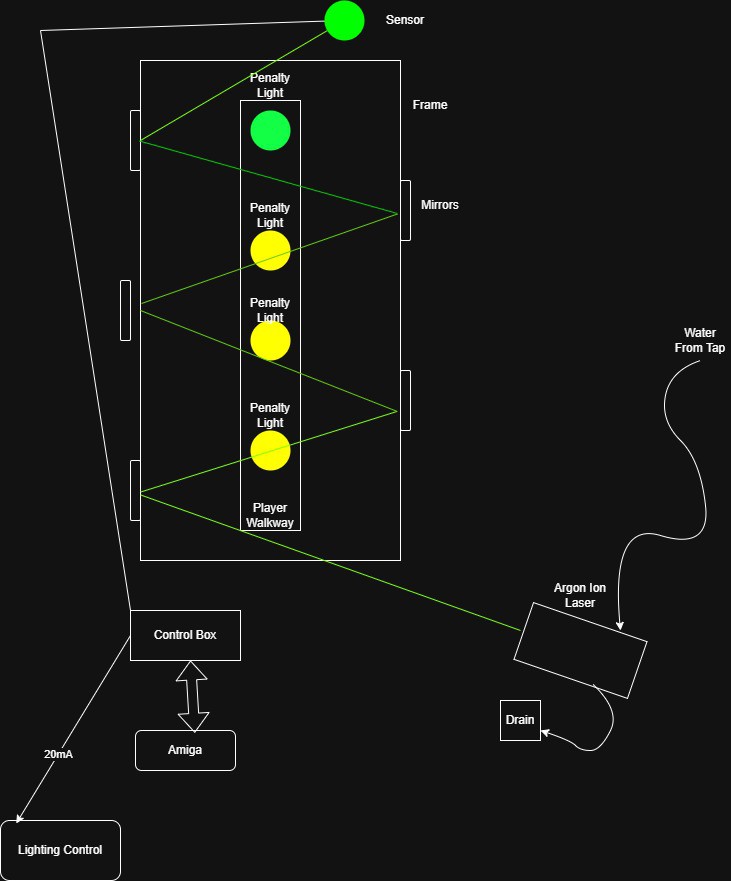 Once completed, the player entered the laser matrix. A beam oscillated between two paths. Breaking the beam triggered a penalty light, and the player had to remain still until it went out. This, in effect, was a time penalty for breaking the beam