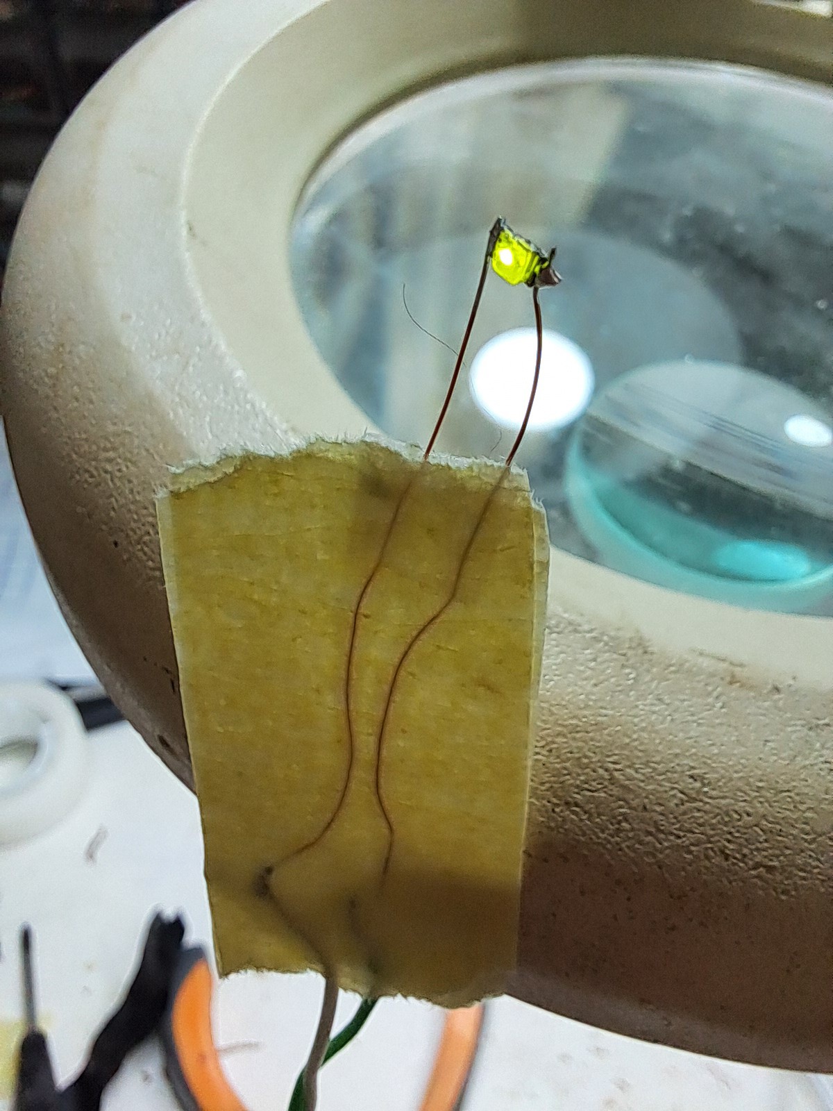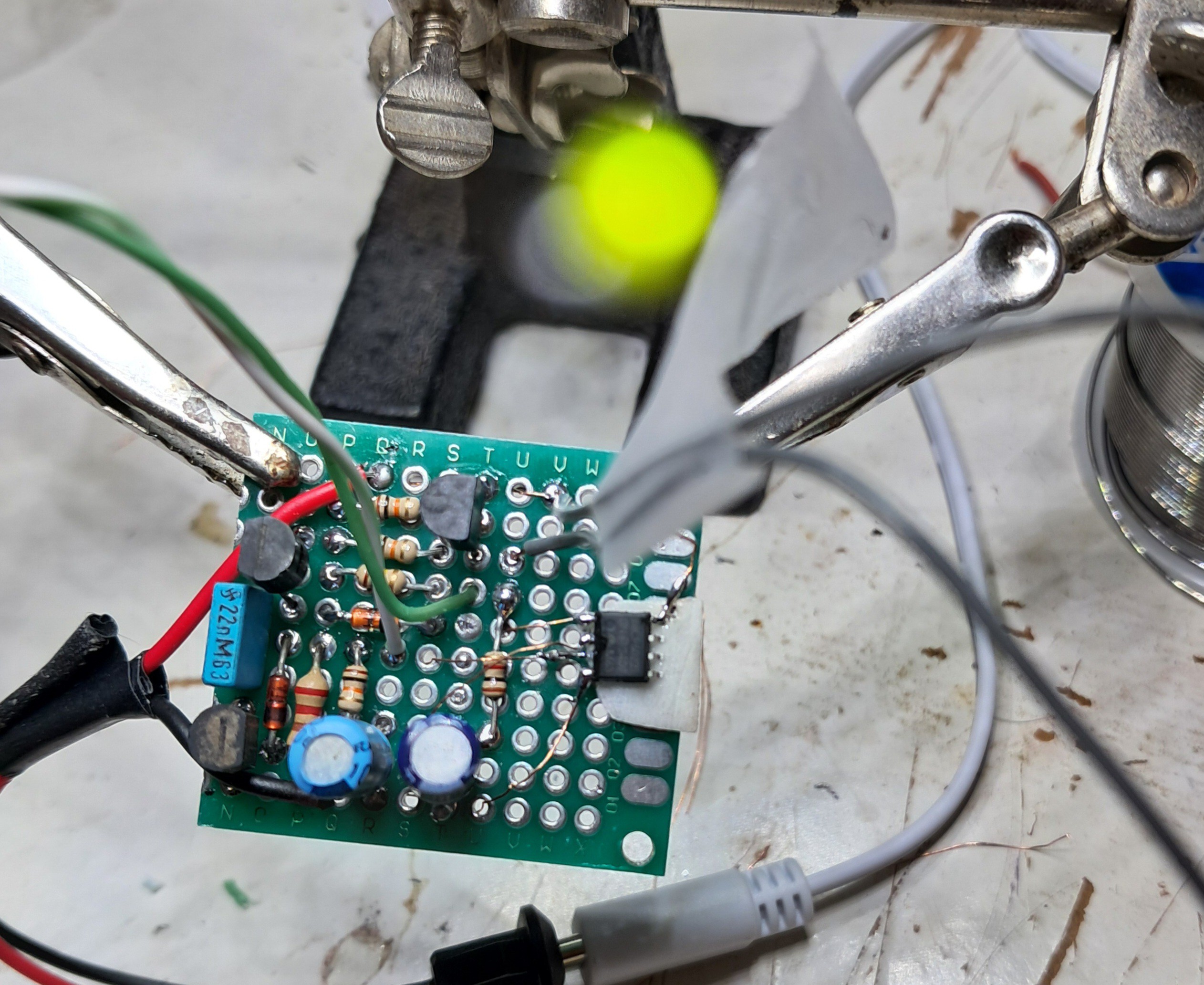 - LED1, the blow sensor, is a small SMD LED mounted on thin wires to minimise thermal mass and improve airflow sensitivity.