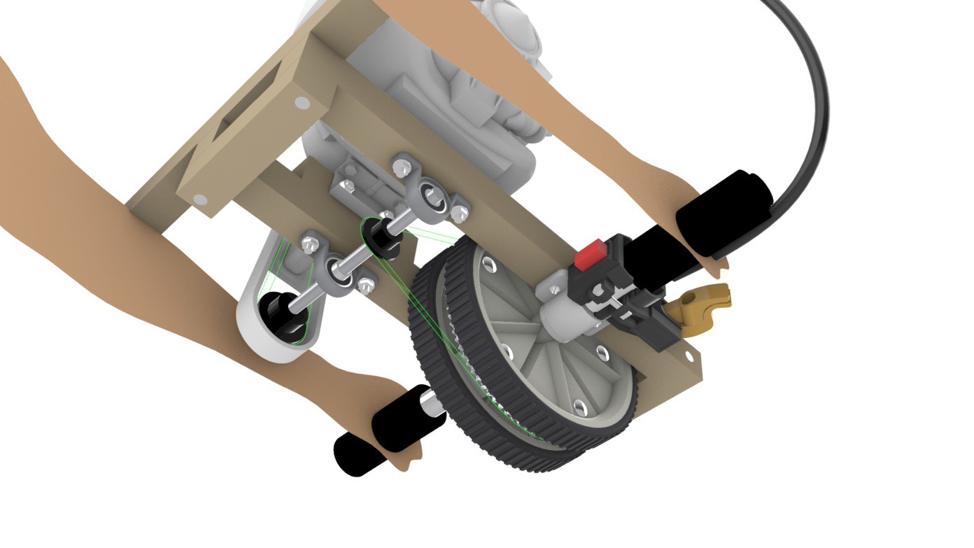 The ab roller I used is the “SINTEX Training Abdominal Roller Exercise Wheel.” It consists of two wheels. I chose this model so that I could place the sprocket between the two wheels. This allowed me to keep as much distance as possible between my hands on the handle and the power transmission components for safety.