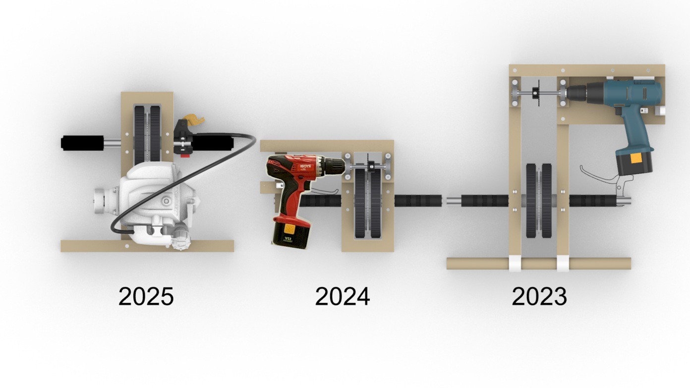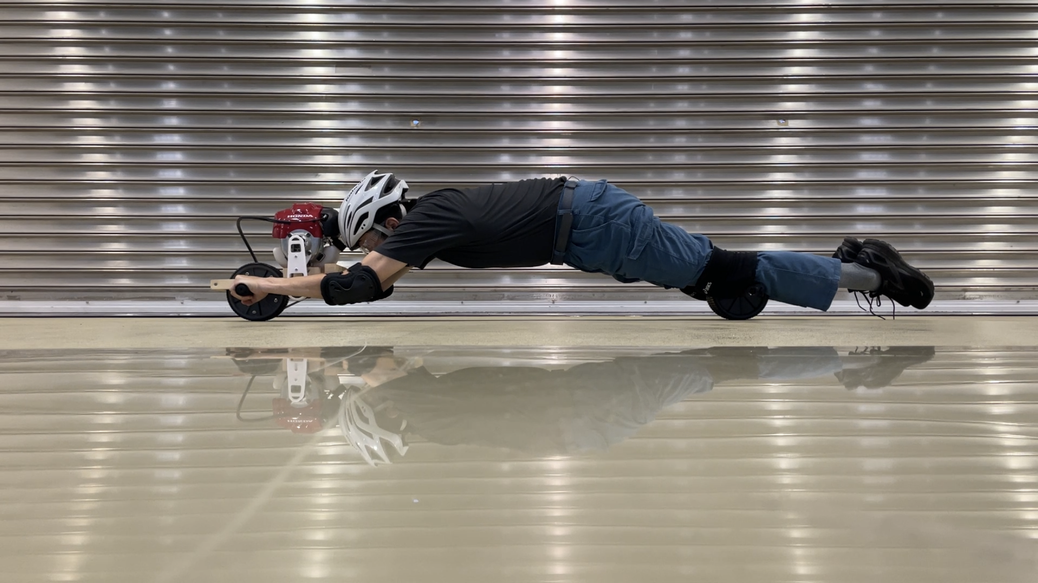 I named the Motorized Ab Roller the “Ab Rider.” This is the third Ab Rider. The first and second Ab Riders were powered by electric drills. I have never ridden a motorcycle, but I wanted to experience riding with the sound of an engine, so I chose to use a gasoline engine for this project. I worked on this project while imagining myself riding it under the open sky. I was able to enjoy the engine sound and my first pull start. I feel fortunate that I was able to make it happen. However, controlling it remains a challenge. It may be natural to solve that by strengthening my abdominal muscles.