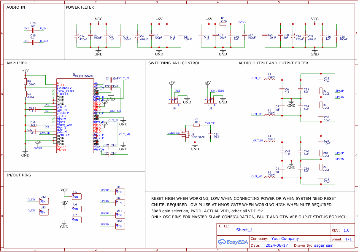 I designed the full schematic in EasyEDA and split it into four functional blocks: Audio Input, Power Filtering, Amplifier + Control, and Output Filter. Let me walk through each one.