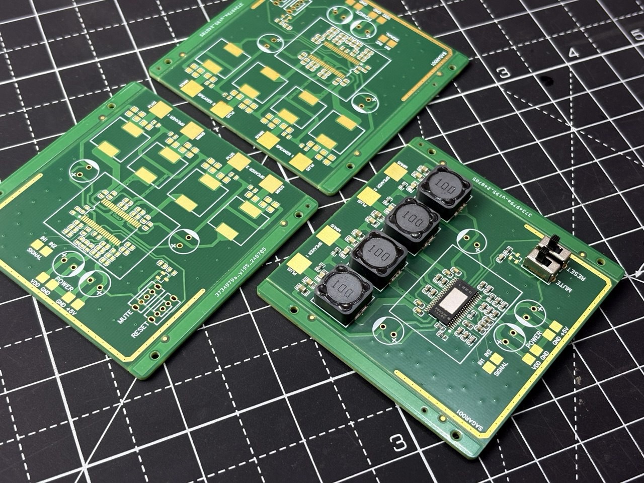 The TPA3221 is configured in stereo BTL mode (2 x BTL). Gain is set to 30 dB by the resistor divider on the GAIN/SLV pin. R5 (100k) pulls to +5V and R4 (39k) pulls to GND. 2. R3 (51k) on the FREQ_ADJ pin to GND sets the nominal PWM frequency to 600kHz. The HEAD pin is left floating, which defaults to AD (amplitude-defined) modulation. AD mode gives lower idle current and better efficiency at low output levels. C1, C30, C31, C32 is 33nF on each BST pin pair. These charge during the low-side on-time and provide the gate drive voltage for the high-side MOSFETs.