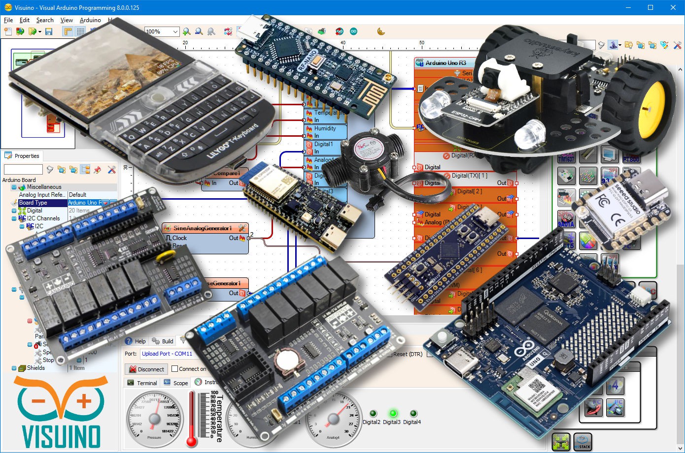 Visuino also includes components for sending multiple data channels through the Serial Port, and the Visuino IDE has Scope and Visual Instruments that can display the multichannel data, allowing the Maker to monitor and display simultaneously multiple sensors or data points from the project.