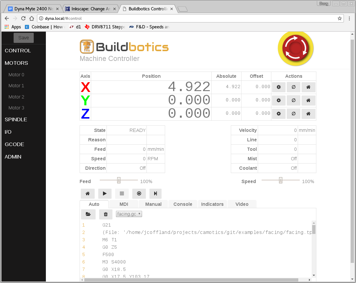 Robot Garden was delighted when Buildbotics offered to revive the Dyna with their new Open-Source CNC controller. The Dyna retrofit demonstrates some of the power and flexibility of the Buildbotics controller. For instance, the stepper motors on the Dyna only provide 27 ounce-inches of torque. The original machine compensated for this low torque by providing a 10 to 1 gear ratio between the motor and the axis ball screws. Given the 2.5 mm pitch ball screws, the machine head would only move by 0.25 mm for each complete revolution of the motor. In order to meet the published jogging speed of the machine (30 IPM), the stepper motors had to turn at 3000 RPM. The controller had to provide over 5000 steps per second to minimally meet that goal. This was a breeze for the Buildbotics controller which is capable of over 200k steps/sec. Performance was further improved with 1/32 micro-stepping. The resulting 160k steps/sec yielded smooth, reliable operation.