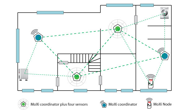 The coordinators control the sensors. Together they create a mesh network in the house that makes sure that all data is properly transmitted to a linux box, a computer or anything else where the MoXi application is running